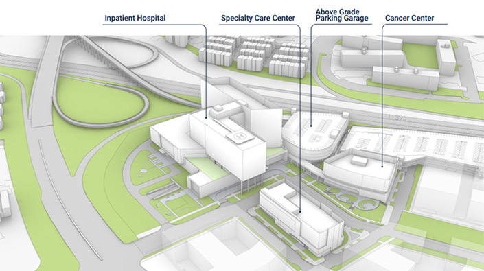 On December 22, 2020, Inova, the City of Alexandria, and development partners announced plans for a mixed-use community and state-of-the-art medical campus at the former Landmark Mall location. The proposed new Inova Alexandria Hospital would allow for comprehensive, patient-centered programs and services that include a larger emergency room; private patient rooms; and the Inova Schar Cancer Institute at Alexandria Hospital, which would offer full cancer services, including radiation and infusion. The addition of a medical office building would allow an estimated 50 specialty physicians to see patients on the same campus as the new hospital. The hospital complex is expected to open in 2028.